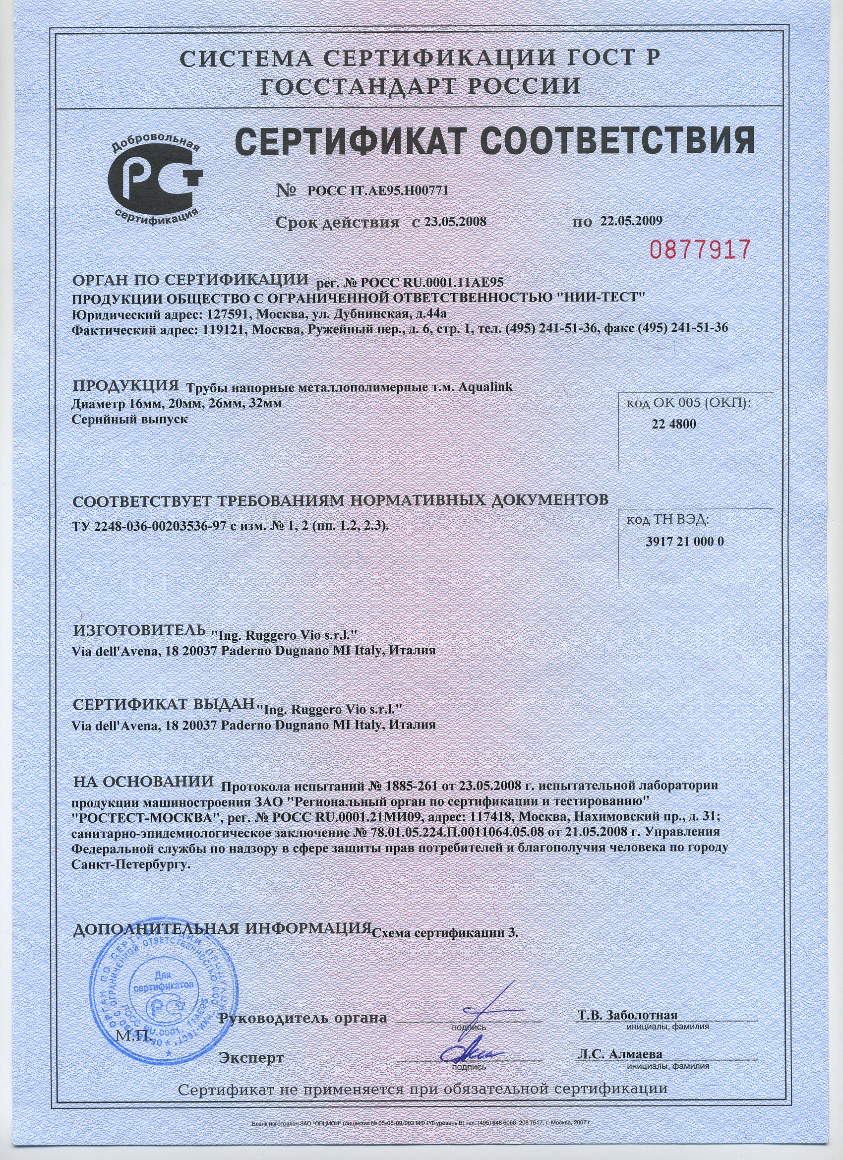Соответствия Труба AQUALINK 23.05.08 22.05.09