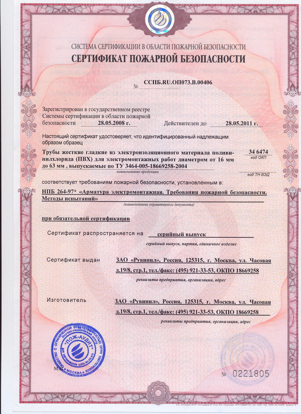 Пожарный Трубы гладкие из НПВХ Ø16-63 Рувинил 28.05.08 28.05.11