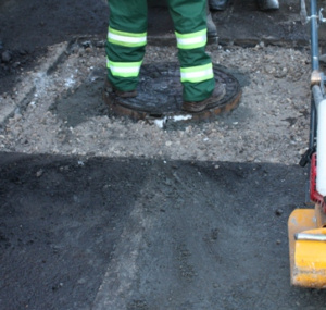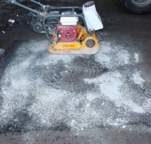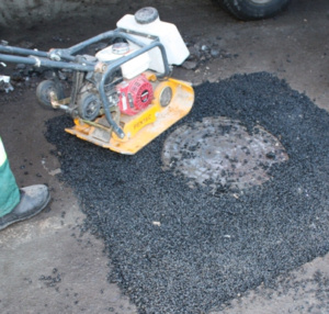 6. Утрамбовать смесь виброплитой или колесами автомобиля (после трамбовки слой должен выступать над поверхностью окружающего покрытия на высоту 15-20 % от изначальной глубины выбоины)