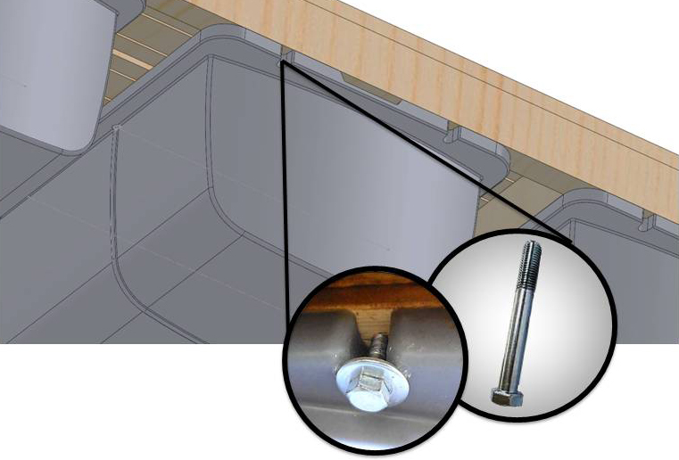 Крепятся модули к настилам посредством шурупа с шестигранной головкой М12-М16 и специальных шайб. Каждый модуль имеет 6 точек крепления.
