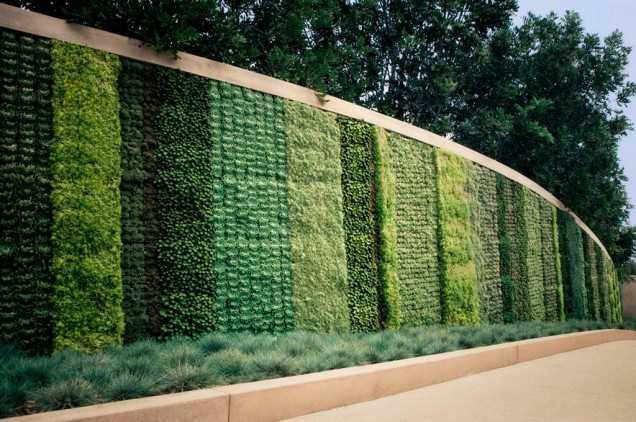 Форма фасада может быть любая, поскольку пластиковую основу и листву можно резать. Модули с искусственной травой имеют разную форму листвы, что придает фасаду разный внешний вид и стиль. Фитомодули для вертикального озеленения подходят для дизайна, и не требуют ухода, как живая изгородь или живые вьющиеся растения. Данными модулями можно декорировать не только внешние фасады здания, но и внутренние помещения, холлы.